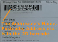 Our system produces 2D barcodes (or RF Tags) which contain a unique tracking number as well as the address, postcode and the persons name.